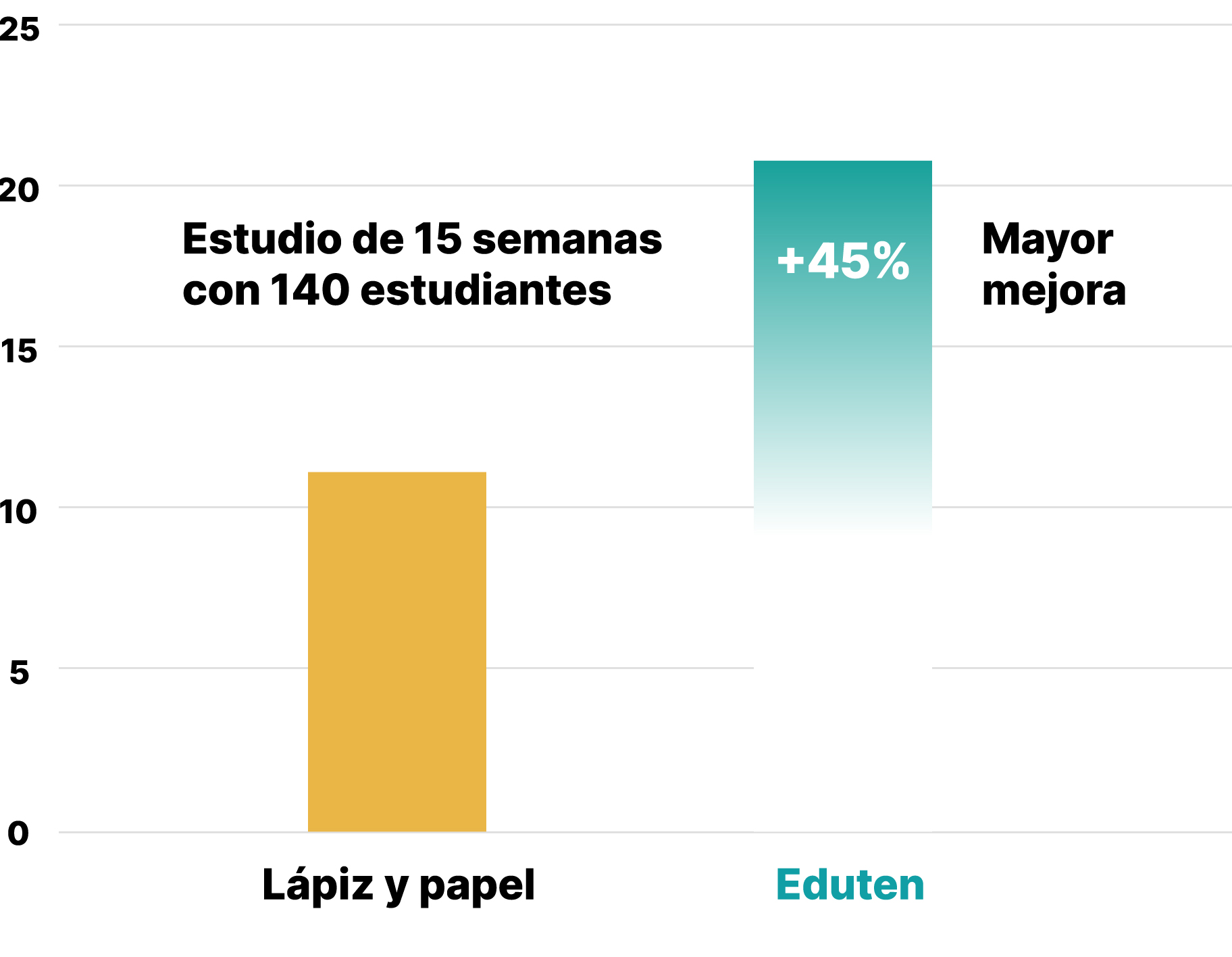 Probado por docenas de estudios revisados por pares y publicados en todo el mundo, Eduten aumenta los resultados del aprendizaje en comparación con los métodos tradicionales.